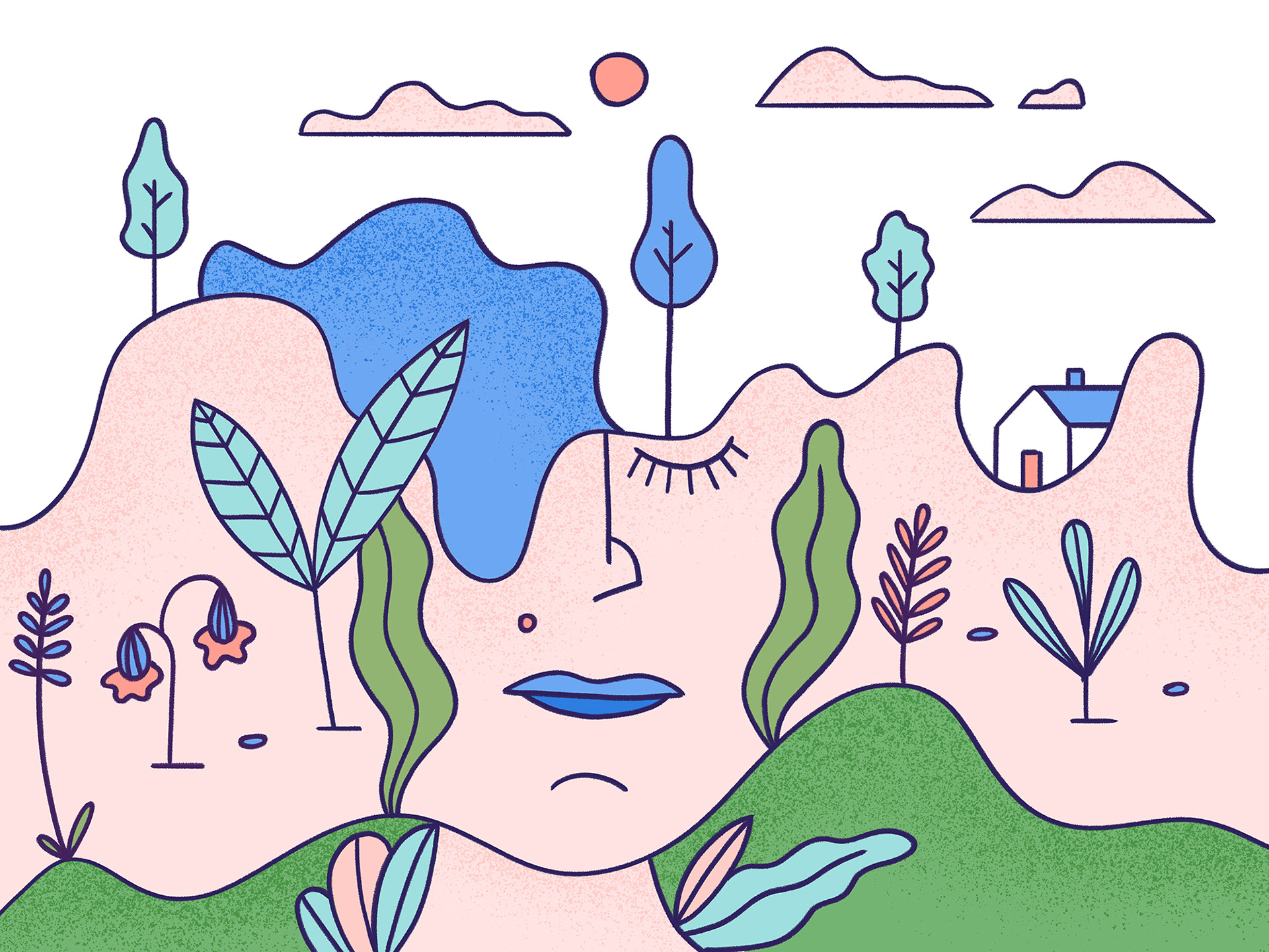 An abstract representation of my favorite season, spring. The sky is actually snow that is melting and uncovers the hills. Nature, represented by the sleeping lady, is coming back to life and will soon be awaken.